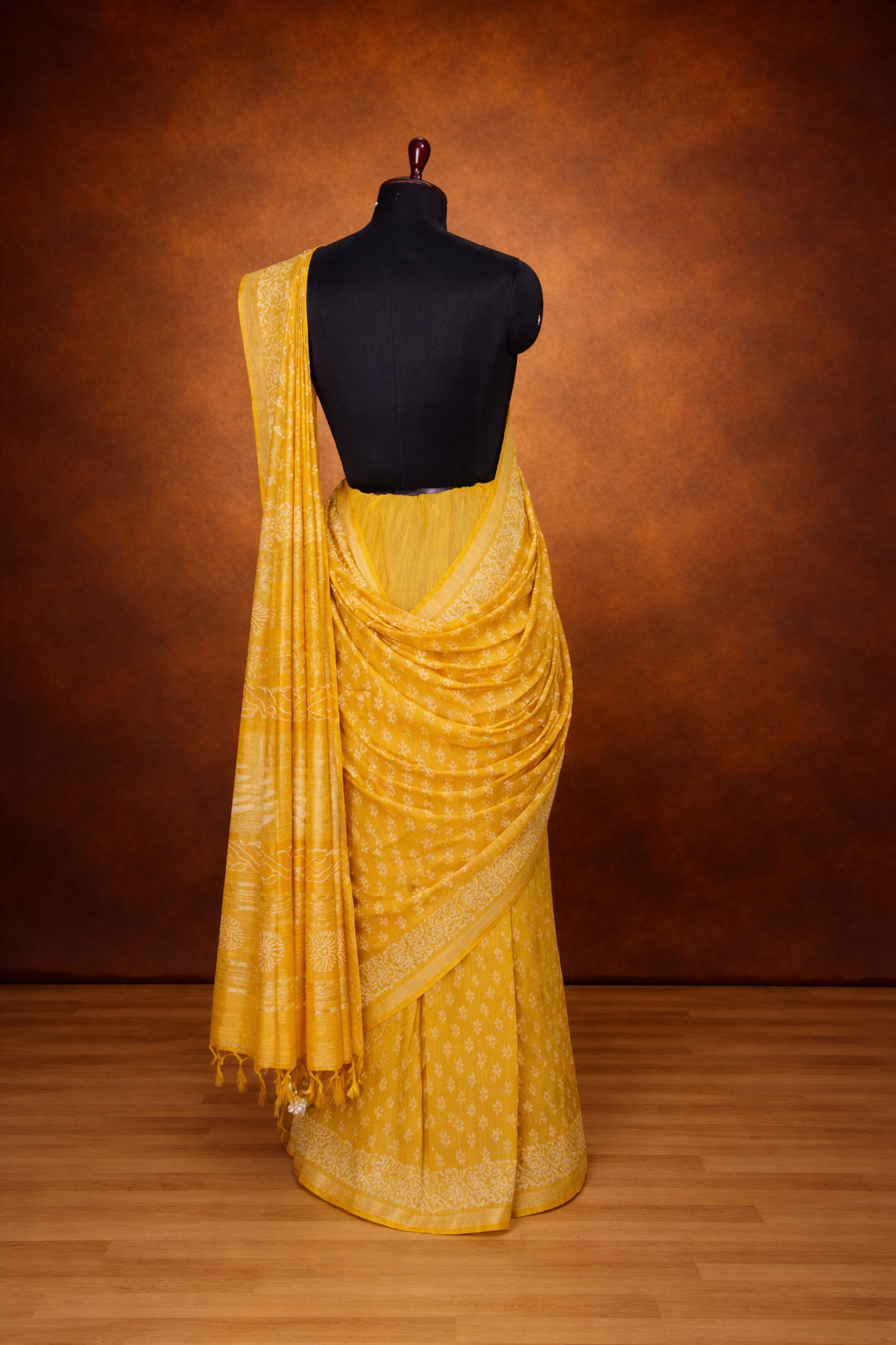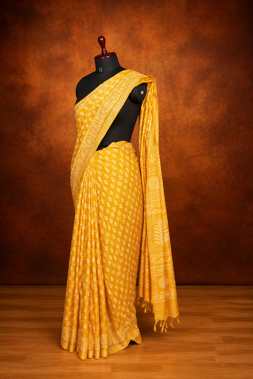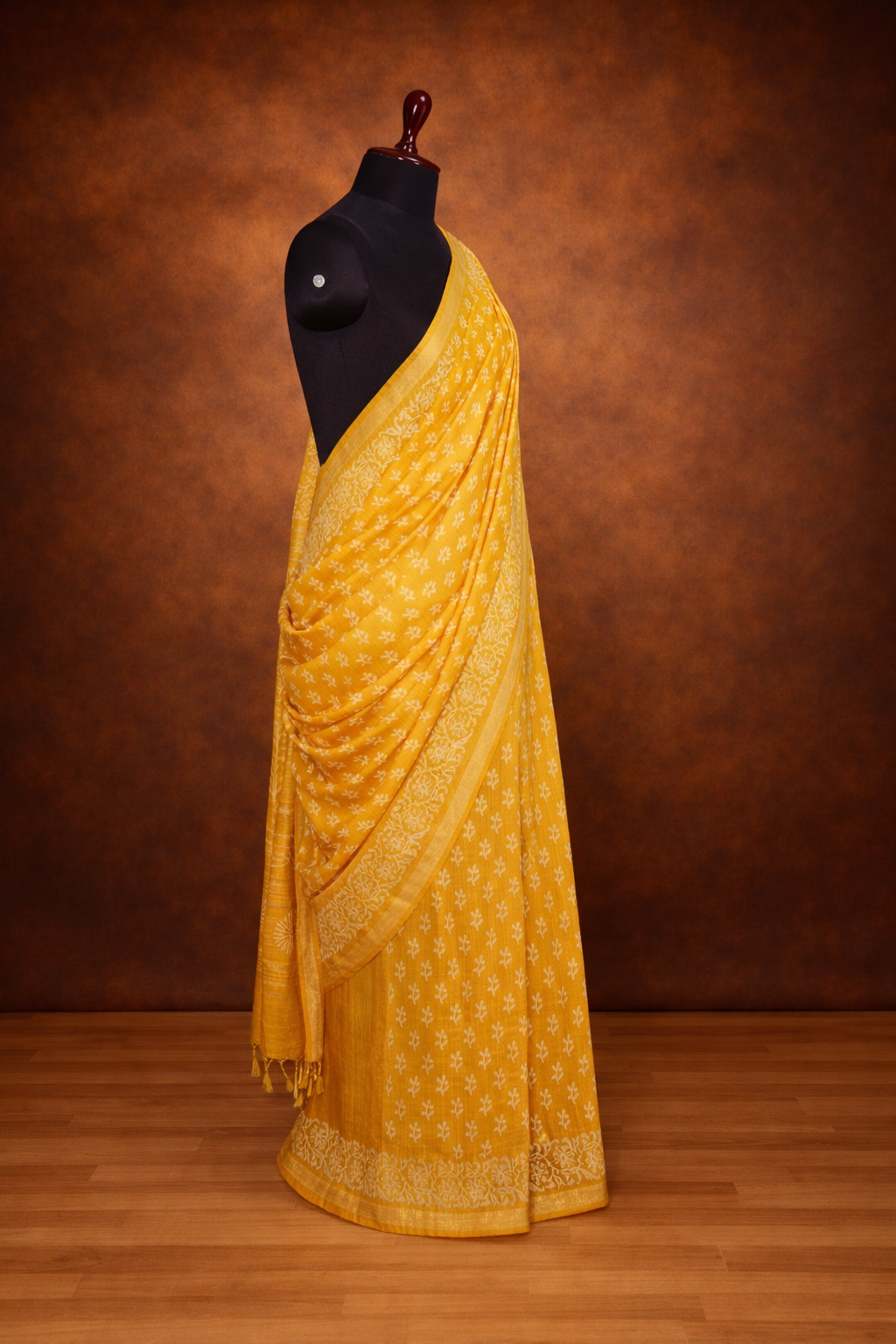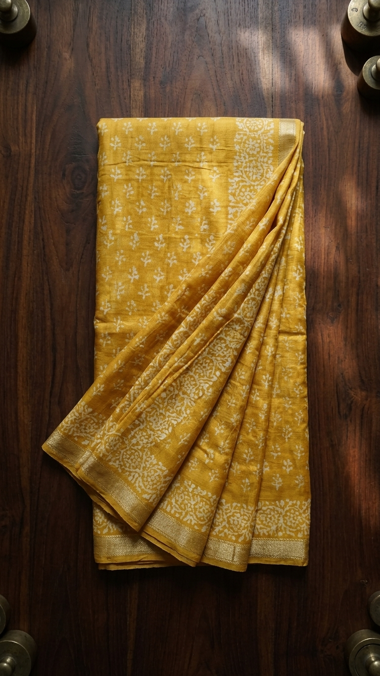 This mustard yellow saree exudes a blend of warmth and elegance, perfect for adding a touch of sophistication to any occasion. The luxurious golden border enhances its beauty, making it ideal for both traditional and festive events. The saree is adorned with a delicate batik print design, offering a unique and timeless appeal that showcases traditional craftsmanship.